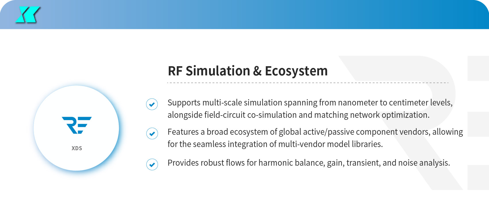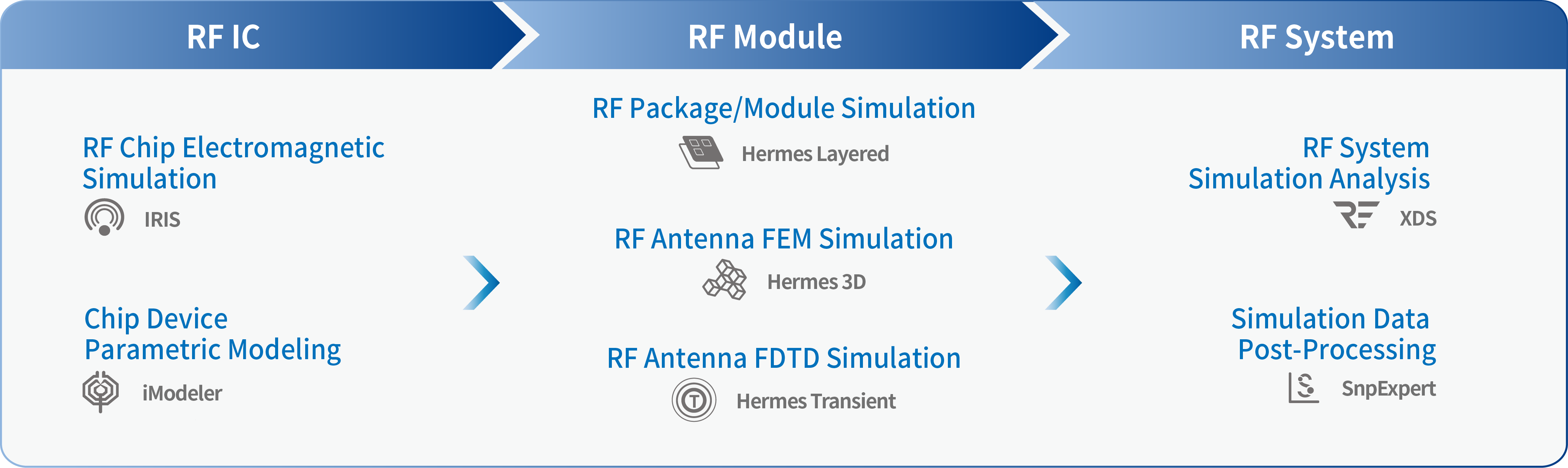 To address these multi-layered challenges, Xpeedic RF EDA solution delivers comprehensive simulation capabilities across the entire “chip–module–system” continuum. It enables system-level co-optimization by integrating device modeling, EM simulation, near/far-field radiation analysis, field-circuit co-simulation, and system verification.
