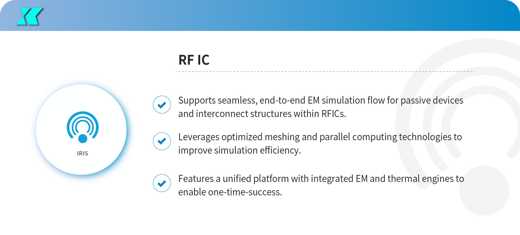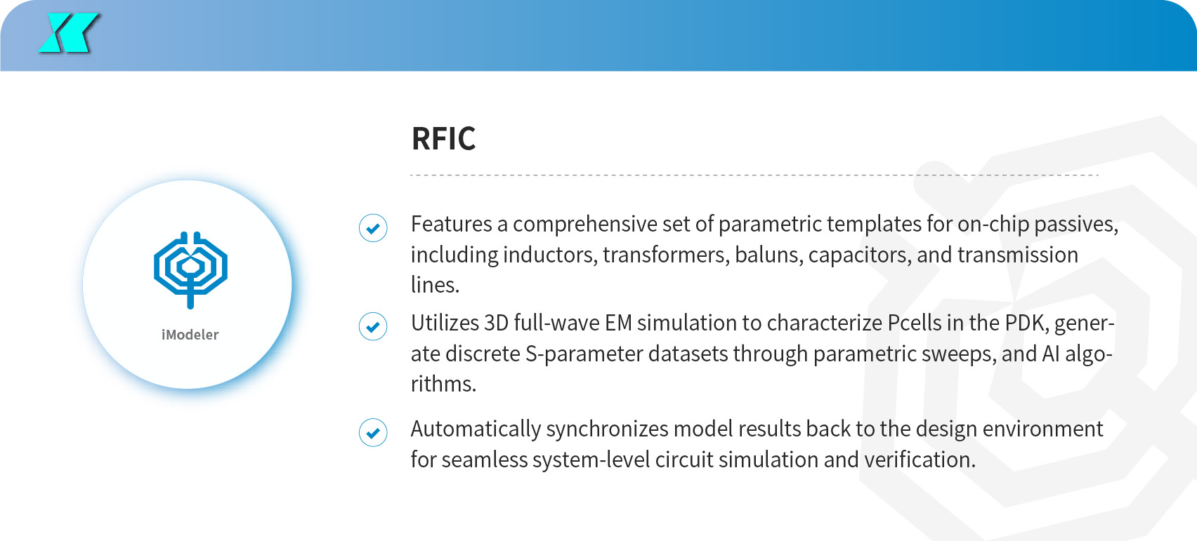 RF IC Level: As process nodes continue to shrink while bandwidth increase, passive interconnects are occupying a significant portion of RF IC design. The structural diversity and applications for on-chip passives—such as capacitors, inductors, transformers, and coplanar waveguides—have become highly complex.